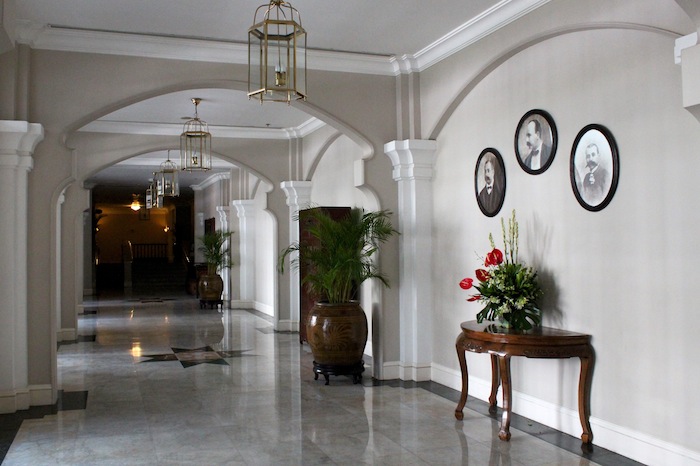 Portraits of three of the Sarkies Brothers, holding vigil over their hotel.