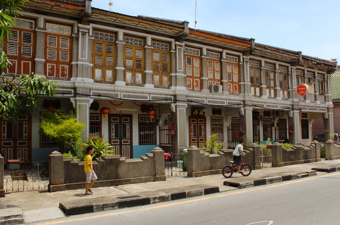 Ochre tones of a row of colonial era shophouses with local boys heading home. Armenian Street.