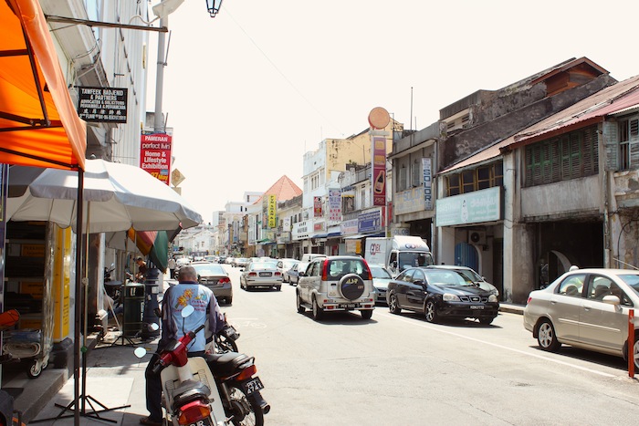 Bright orange tentage abutting a busy intersection. Chulia Street and Penang Street.