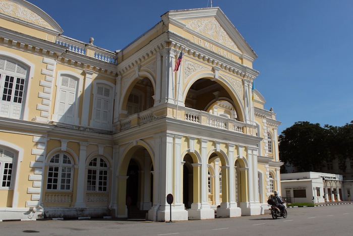 Close-up of Town Hall (1880), and the ubiquitous Penang motorcyclist. Jalan Padang Kota Lama.