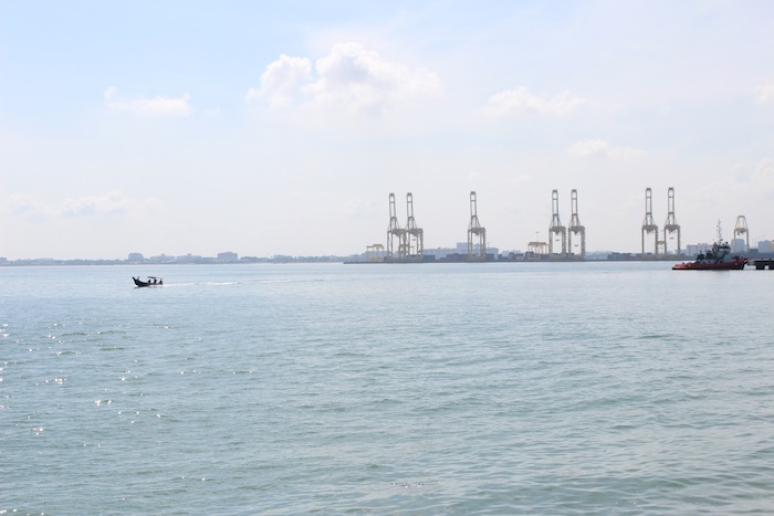 View from the Esplanade of the Port of Penang and a lone fishing boat.