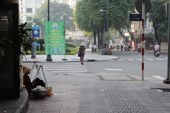 A streetfood vendor in traditional garb sits on Dong Khoi Street, contemplating what Saigon has become. To the left are the Vincom Towers.