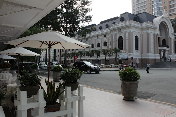 Across from the Eden Center sits the Hotel Continental (1880). This is the view from its famous terrace (in the foreground), where countless writers and journalists have installed themselves, in order to observe the city’s comings and goings. In the background sits the restored Opera House, previously the Vietnam National Assembly, and now the Municipal Theatre.