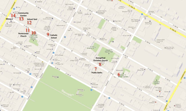 Between Avenues C and A lie a trio of quaint, verdant and tranquil community gardens. Alongside these gardens are a number of community places of worship representing Christianity and Islam; as well as a couple of community facilities including a junior high school and an old public bath. This makes for a surprising number of scattered Edens, or pairidaezas in the area – enclosed sanctuaries where one can seek solace and communally grieve for Paradise Lost.