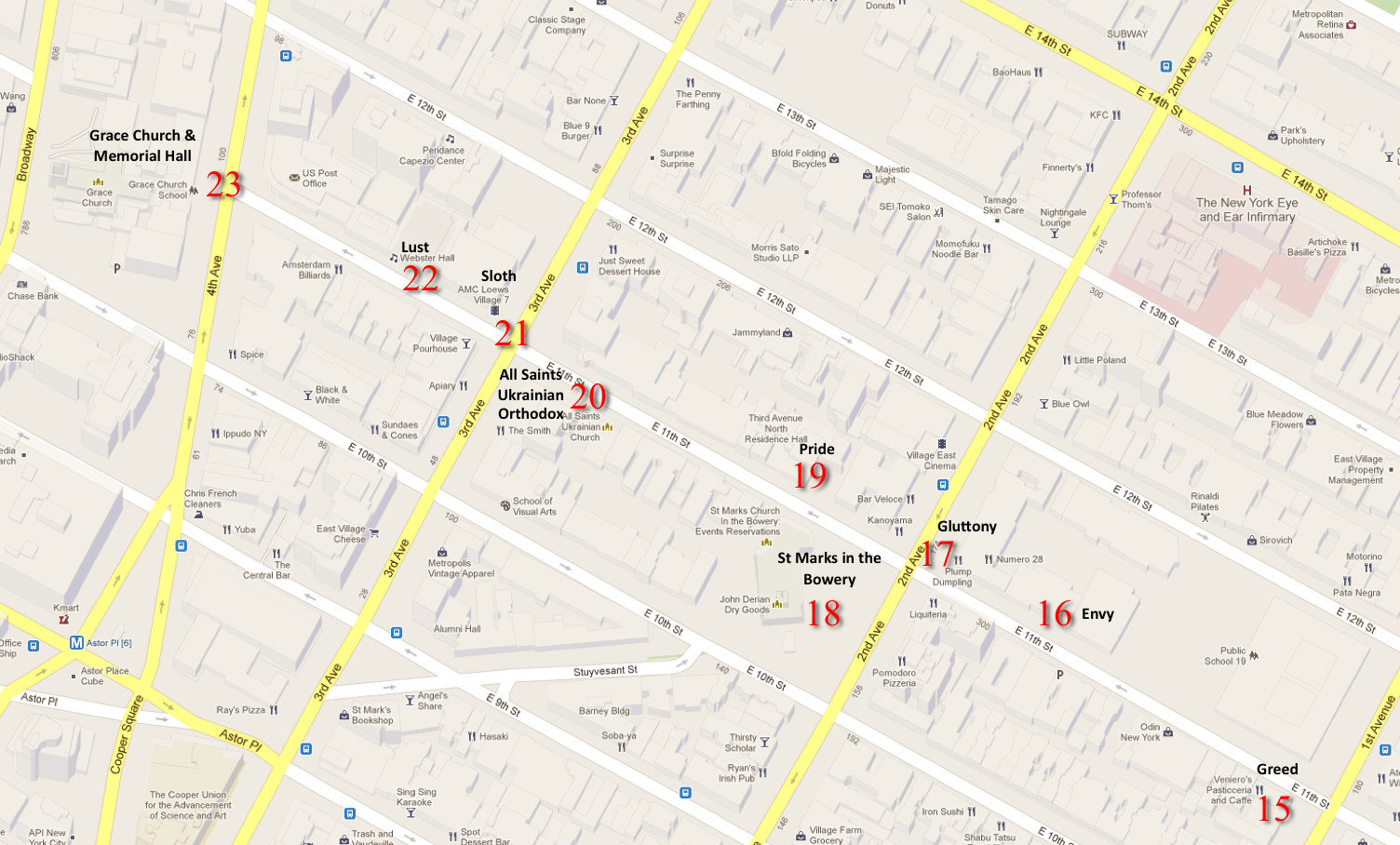 Don’t be fooled by the outwardly placid nature of these three blocks just past Alphabet City. This is a battleground for Mankind’s soul. The Cardinal Sins manifest themselves here, in a multitude of seductive forms designed to part the pilgrim from his hard-earned money and peace of mind.
