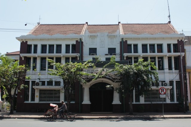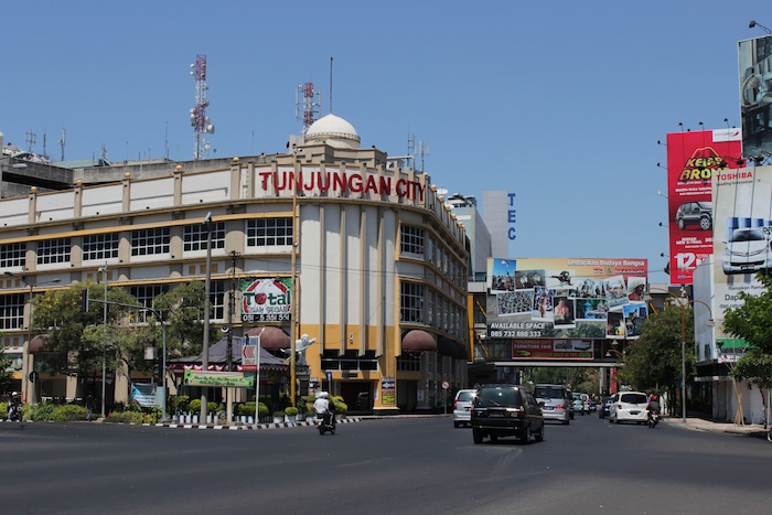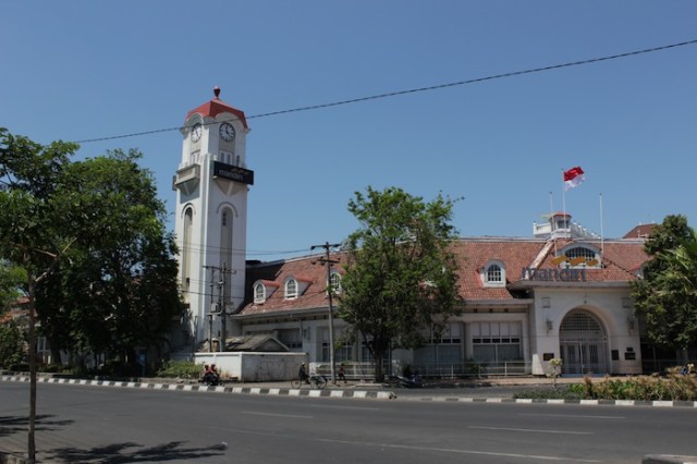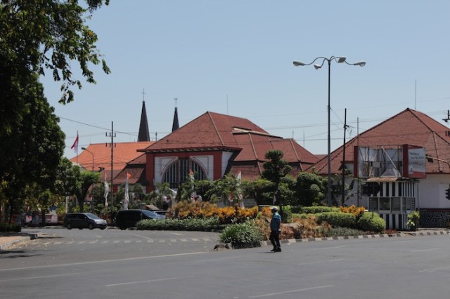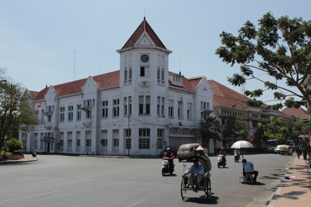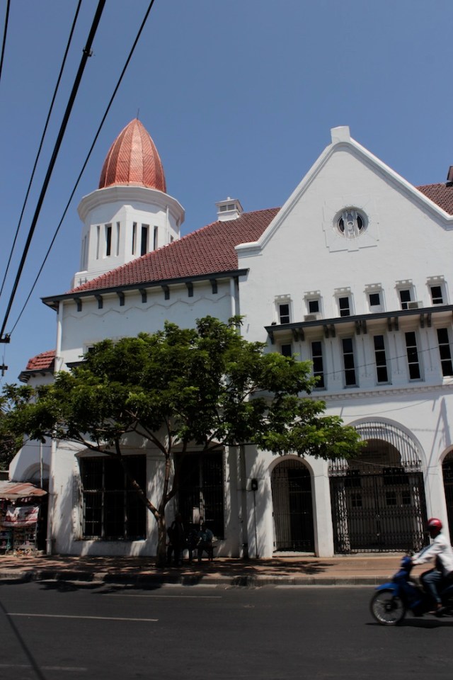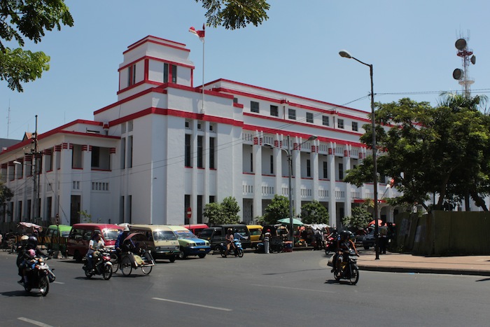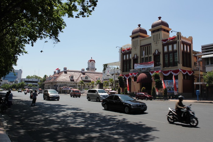 View on Jalan Pahlawan towards the Surabaya City Post Office (1800s), which was the Governors’ House till 1928. Behind it are the twin spires of the Geraja Kelahiran Santa Perawan Maria – the oldest Roman Catholic Church in Surabaya.