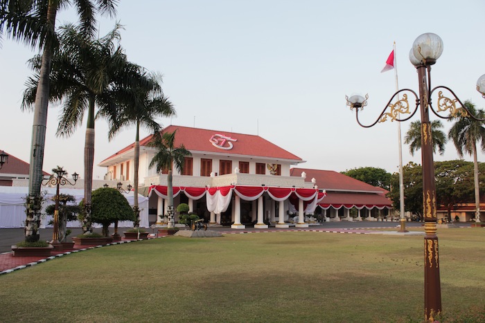 Grahadi Building (1795), previously the Raad van Justitie (High Court), and now the residence of the Governor of East Java. Jalan Gubernor Suryo. Behind the building flows the Kali Mas.
