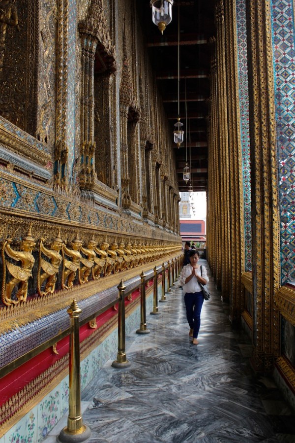 Fig. 5 – View along a side corridor of the Temple housing the Emerald Buddha. Note the endless row of gold Garudas to the left. And of course, the exquisite detail.