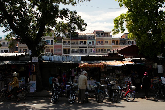 The very human scale and feel of Phnom Penh: 1960s apartments in the background and a market in the foreground.