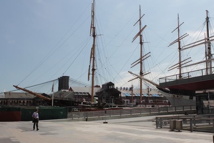 The landscape here is a watery one, almost devoid of persons, but peopled with dead ships – proud vessels from a bygone age, replete with masts, starboards and other parts one only makes mention of in pirate movies. Today, they stand anchored at the South Street Seaport, mere shadows of their former selves, never to set sail again.