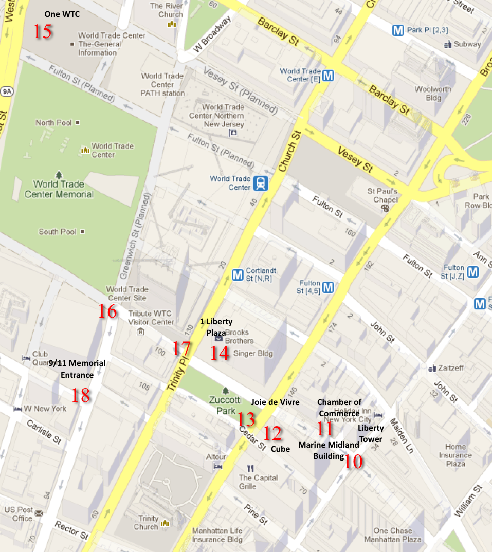 Because Liberty Street cuts through the WTC site itself, one must make a detour along Greenwich Street and Albany Street, where the entrance to the 9/11 Memorial sits, regaining Liberty Street on the other side of the WTC site.