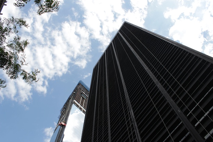 14 – The hulking, portentous blackness that is 1 Liberty Plaza (1971 – 73), built by U.S. Steel to a design by Skidmore Owings & Merrill. One WTC peeks out just beyond.