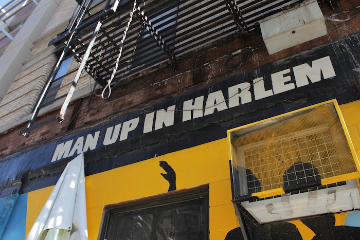 The highlight of the gallery is “Man Up In Harlem,” a community mural by a resident prayer group for men, who take it upon themselves to address community issues like domestic violence and gun control through prayer and engagement. The mural sits across a related piece celebrating the sense of comradeship in the community.