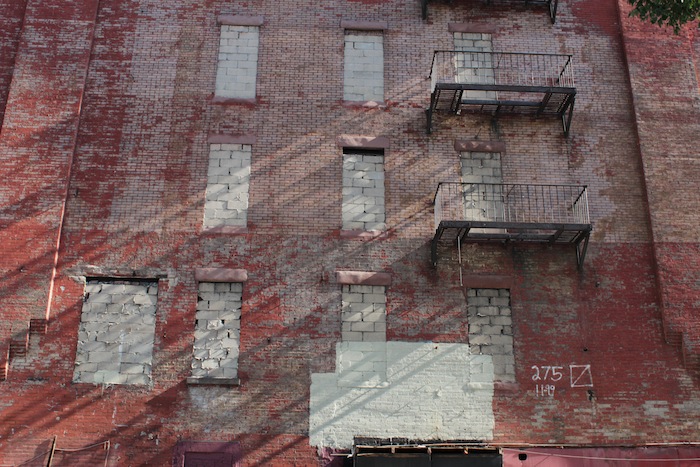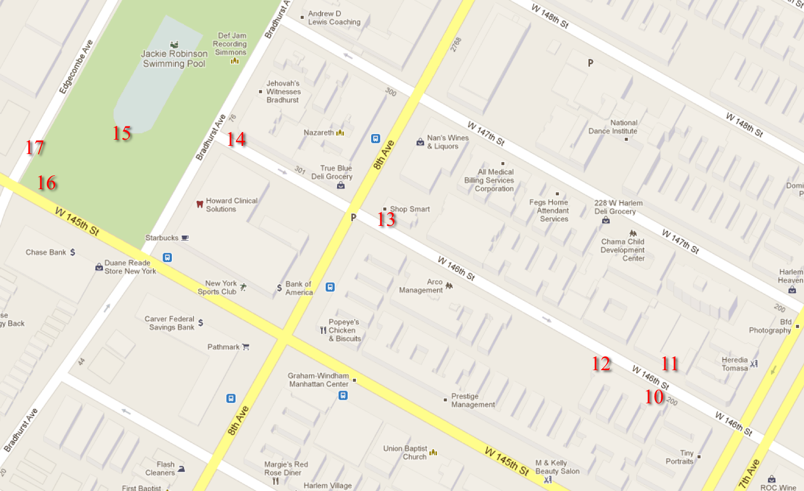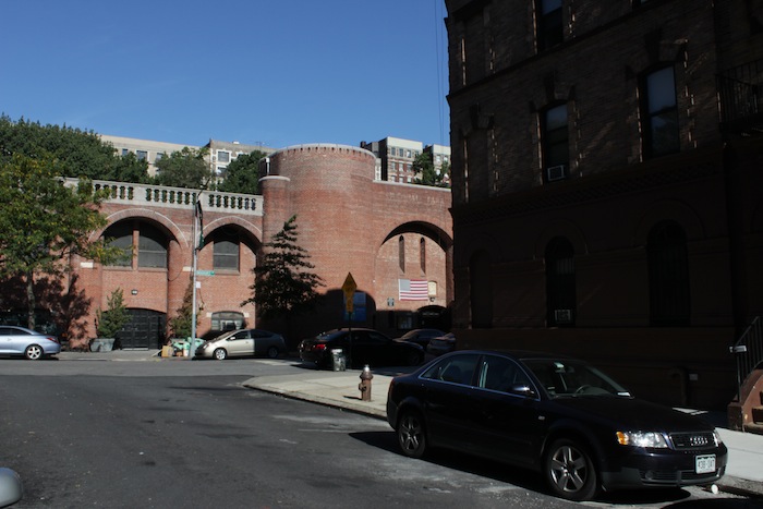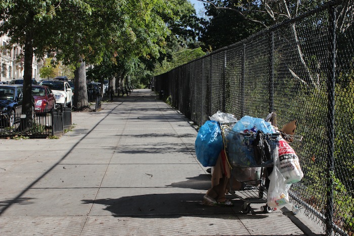 Past the twin murals are a landscape of economic decline, culminating in the deserted wilderness of Jackie Robinson Park. Once a bustling north Manhattan public space, today it’s largely the haunt of junkies and the homeless. Within the park sits the haunting shot of the Jackie Robinson Swimming Pool, shut indefinitely, while just past the park of Edgecombe street, sits a similarly disturbing shot of an abandoned shopping cart, loaded with plastic bags that undoubtedly contain some homeless person’s life possessions.