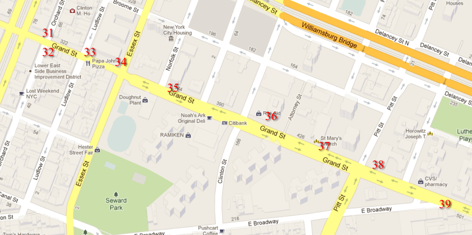A bit of the Lower East Side strays into Grand Street. And this is the Lower East Side as it is traditionally envisioned – a little rough, depressed financially, slightly more religious. Here there are 99 cent stores a plenty, and buildings appear in shades of grey, washed out brown and brick red.