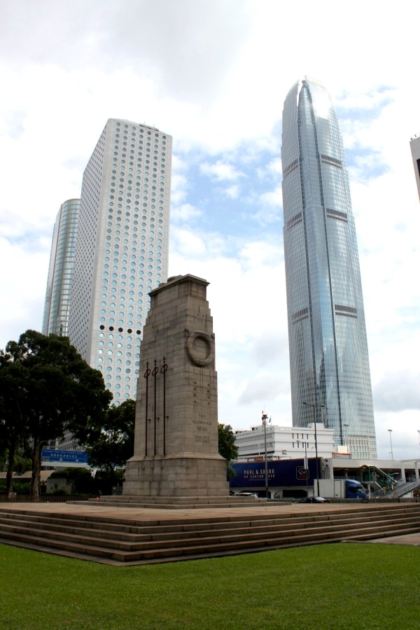 The Cenotaph (1923), commemorating the dead in both World Wars. Behind it is Jardine House (1972) by Palmer & Turner, and 2 International Financial Centre (2003) by Cesar Pelli