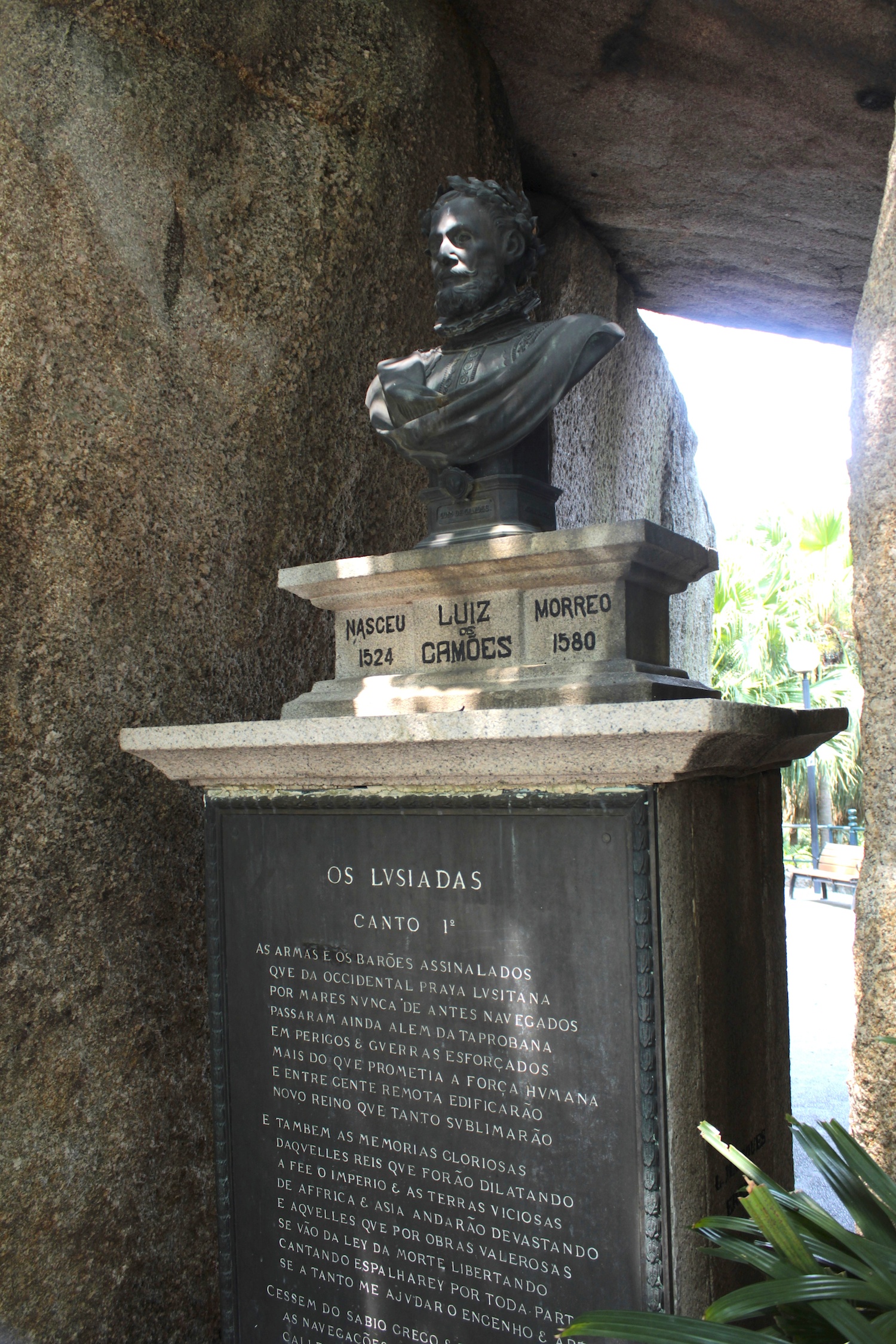 Bust of Luís de Camões (1524 – 1580), the famous Portuguese Poet who wrote the epic Os Lusiadas. He is purported to have lived in this grotto with his local wife in 1557. The bust stands in Camoes Garden.