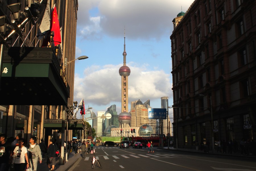 Nanking Road today ends with a view of Pudong and the Oriental Pearl Tower. to the left is the famous Cathay Hotel; to the right, in the shadow, the equally famous Palace Hotel.