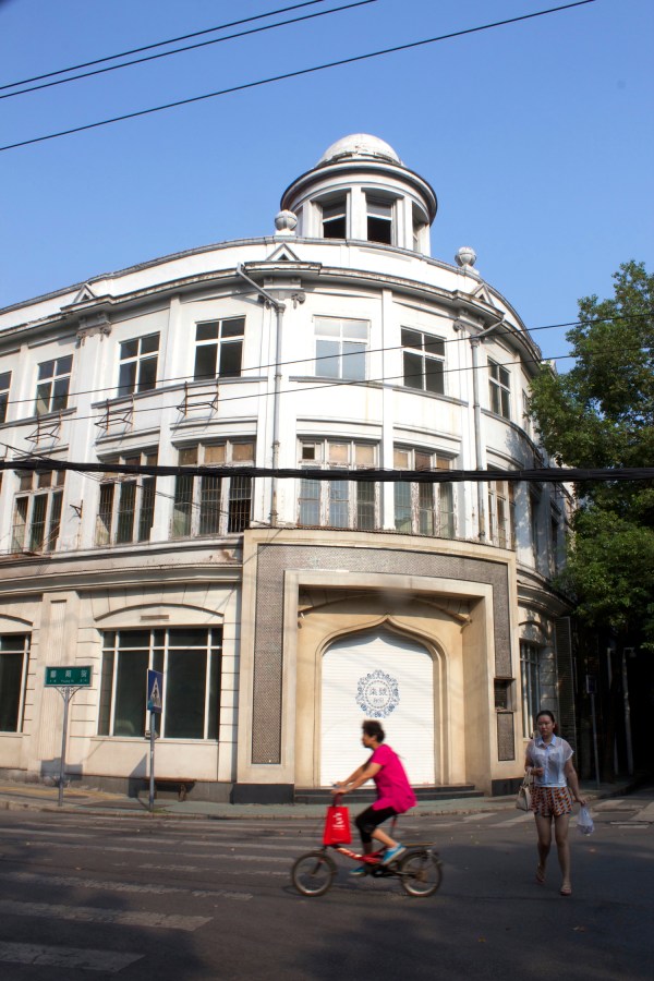 A lady cycles past a building at the intersection of the Russian and French concessions.