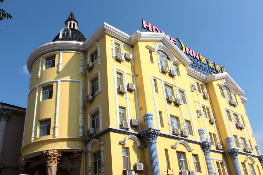 The turreted structure to the left is possibly an existing building, with a new structure appended to the right.