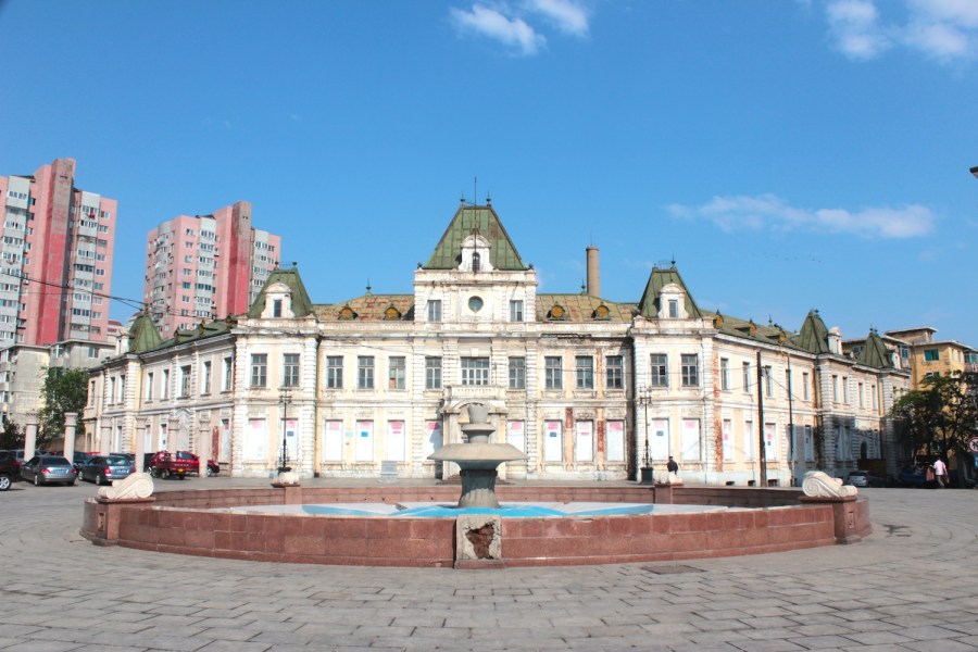 Dalny City Hall, standing silent and somewhat derelict in its own square.