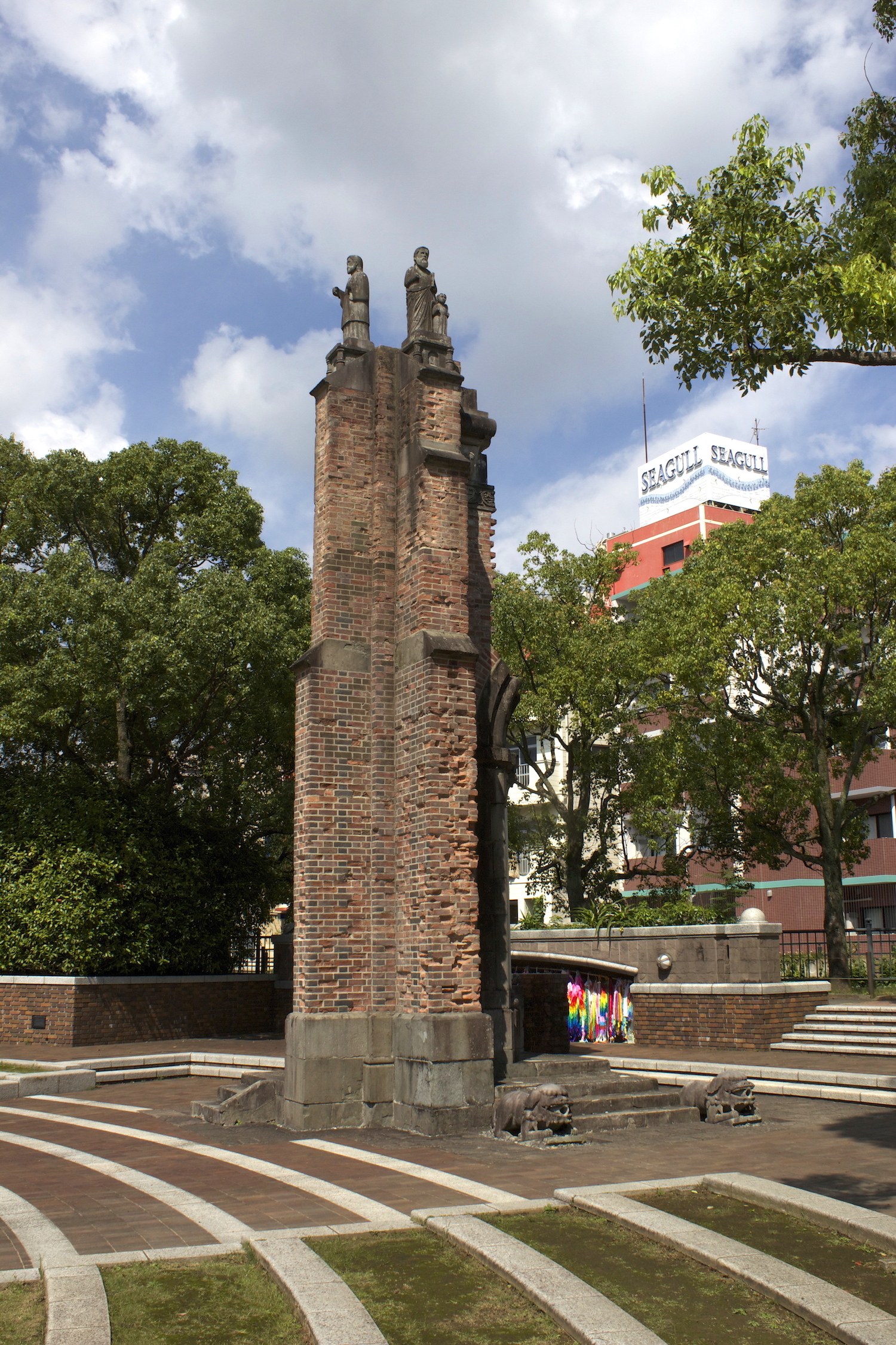 The Ruins of Urakami Cathedral, built in 1925. The Atomic bomb dropped only 500m away in the village of Urakami and completely demolished it. While the Cathedral itself has been rebuilt, this fragment has been moved to the Peace Park as a reminder of the event.