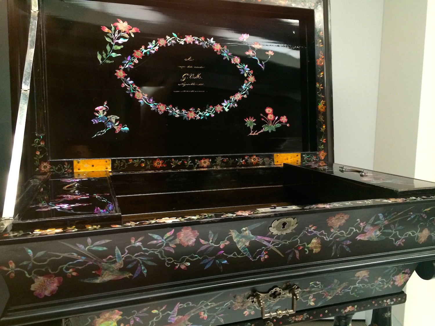 Nanban Sewing Table – interestingly the date and origin: “1851 Nagasaki” are inlaid in the inside of the cover. This is late Dutch era, just before Dejima would be abolished.