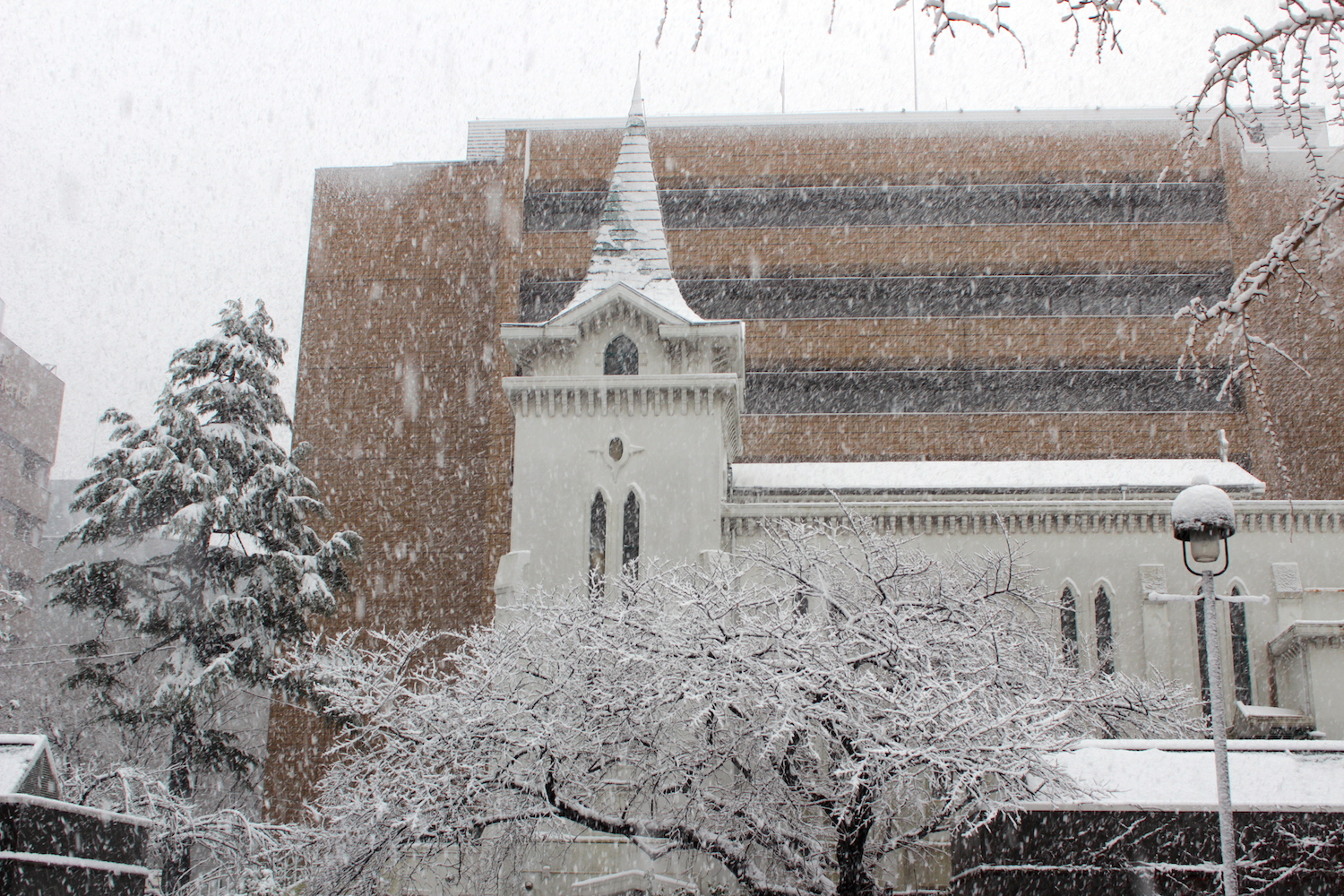 Around the corner from Nihon Oo dori is the Kaigan Church again, this time in the middle of heavy snowfall.