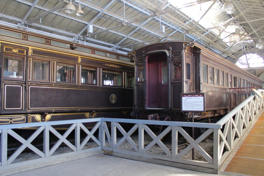 Imperial Carriages of Empress Shoken (1902 – left) and Emperor Meiji (1910 – right), in the Shimbashi Factory of Japan Railway Bureau, Tokyo (1889).