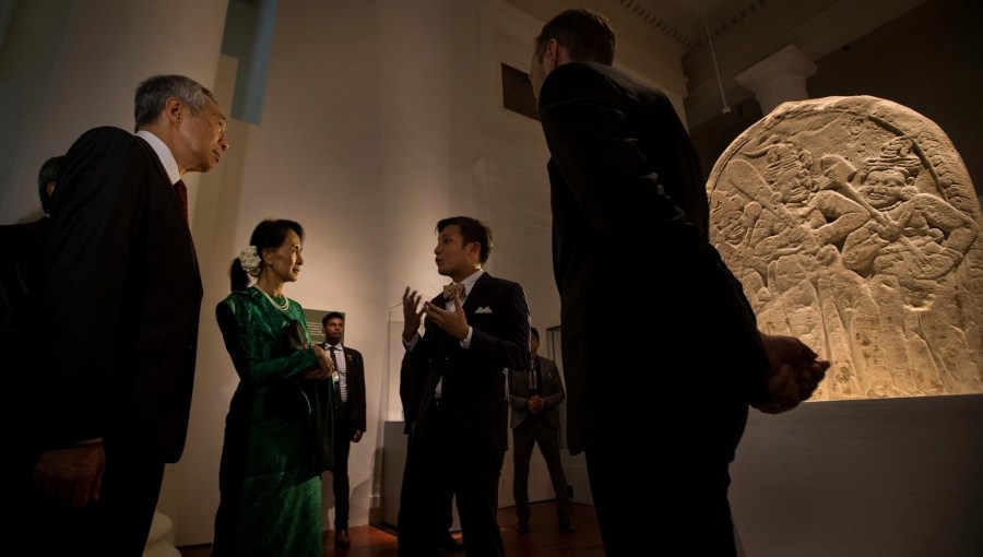Providing an overview of the CITIES & KINGS – ANCIENT TREASURES FROM MYANMAR exhibition to Daw Aung San Suu Kyi and Singapore Prime Minister Lee Hsien Loong at the exhibition opening, 1 Dec 2016. The two world leaders were our Guests of Honour.