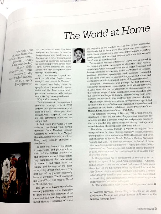 I wrote quite a few opinion pieces and took on many interviews to promote PORT CITIES. This is my favourite opinion piece, which was published in PRESTIGE. It was about my search for identity, and how it led me to Asian port cities, and finally to ACM.