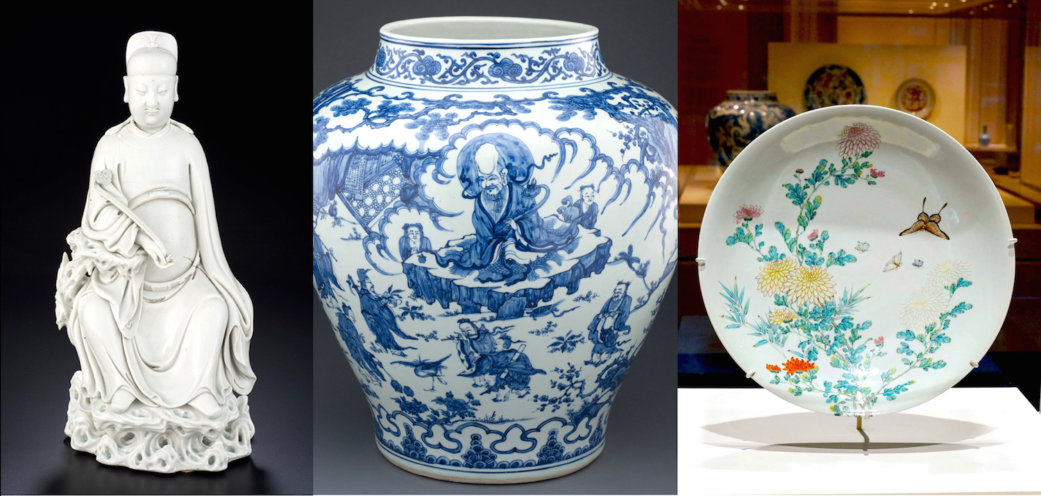 Blanc de Chinem or Dehua ceramics; Blue & White jar; Butterfly and Chrysanthemum Dish. Collection of the Asian Civilisations Museum.