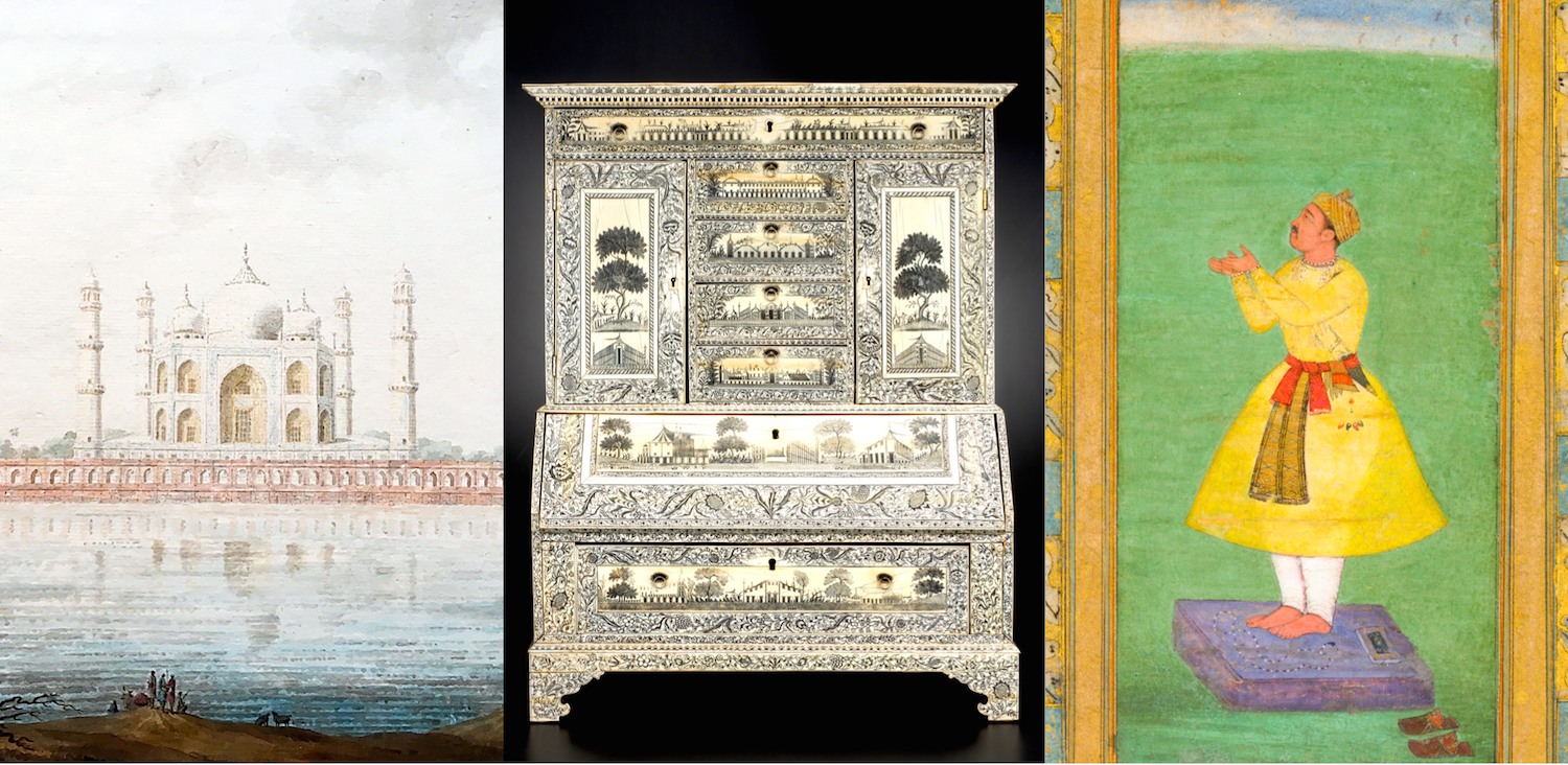 Company School watercolour, Taj Mahal, 18th c; VOC-era ivory secretary, Vizhagapatnam, 18th c; Mughal minature, 18th c. Collection of the Asian Civilisations Museum.