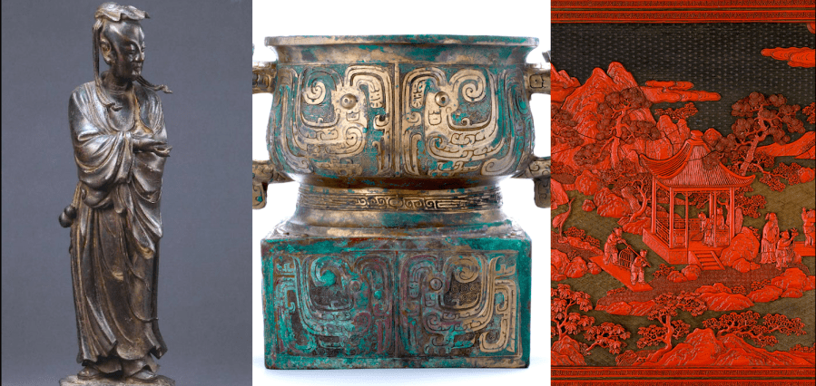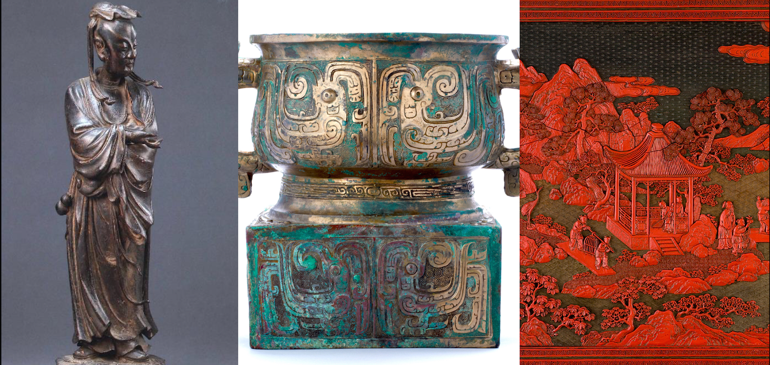 Bronze Lu Dongbin, ritual gui and red lacquer screen. Collection of the Asian Civilisations Museum.
