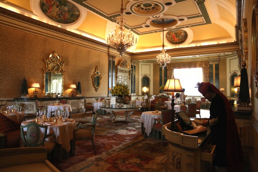 Suvarna Mahal, the palace ballroom, built in an exuberant 18th century French style, complete with chandeliers.