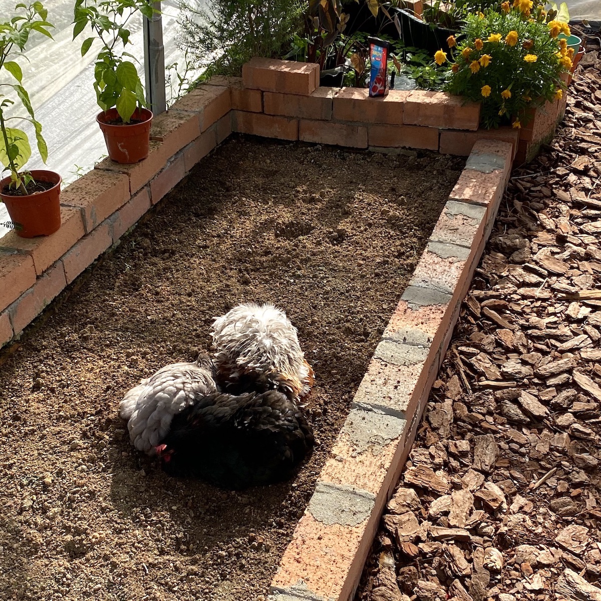 The remaining Bantam Cochins have been brusquely gathered into one coop, with the smallest of the lot – our Malvolio – being bullied relentlessly and maliciously by the other three; she’s gone quite bald from all the vicious henpecking.