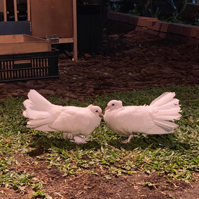 Peace has gradually returned to Illyria. The chickens and quail are laying again. The paradise whydah has lost his pinstripe tailfeathers. A brand-new pigeon – our Viola – has been recently procured.