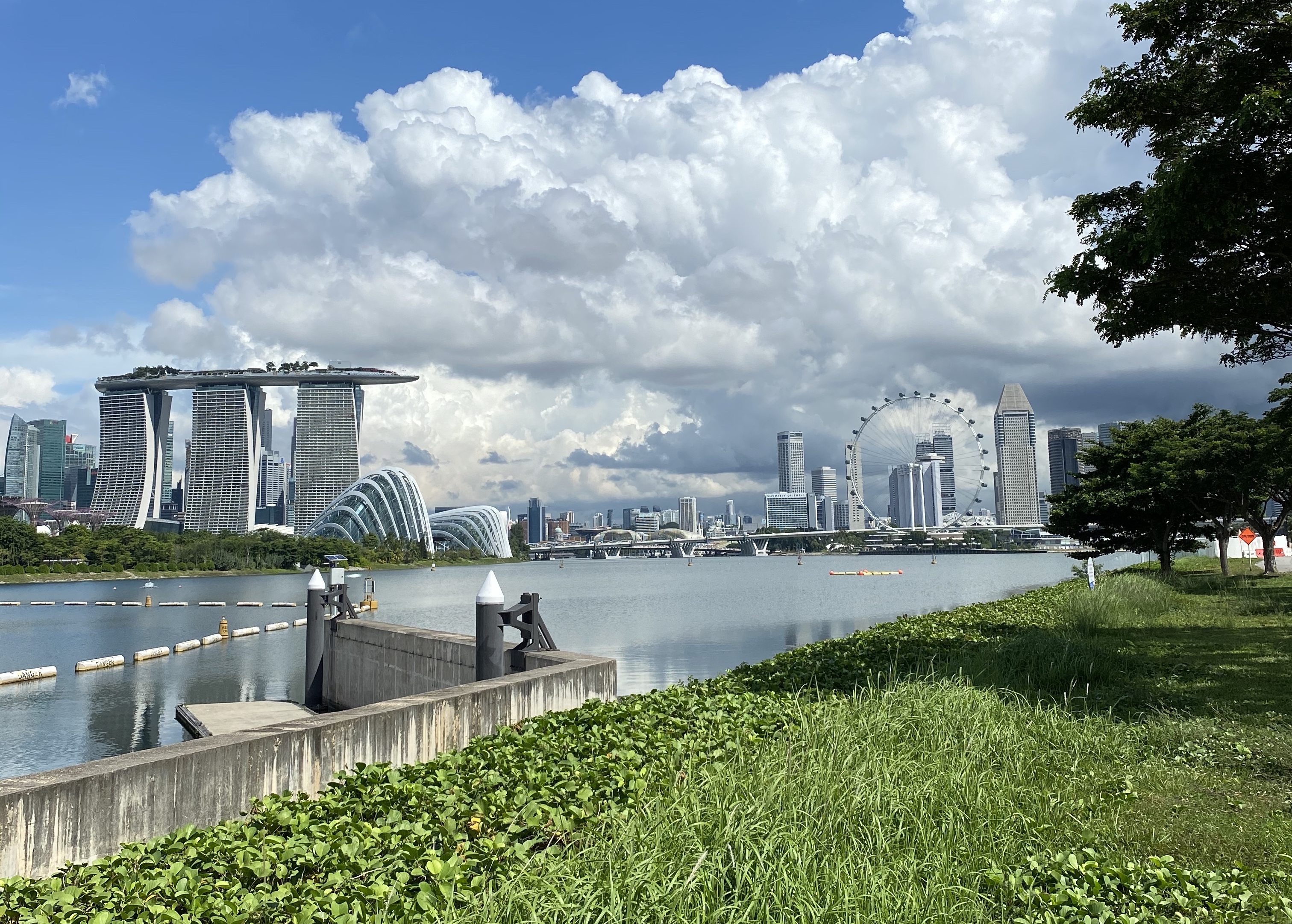[CAPTION: The Singapore Skyline from Bay East Gardens. Sometimes, I ride my bike from home all the way into the city, all around Marina Bay, and back. I find it amazing how there’s almost seamless public infrastructure – the Park Connector Network (PCN) – that allows one to cycle continuously for hours and take in the best sights of the city. I typically stop briefly after crossing the bridge at Marina Barrage, to take in this breathtaking view of the skyline and the Bay, and to reflect on past, present and future. I typically choose to cycle just before lunchtime, when it’s hot and sunny, there’s hardly anybody else on the cycle paths. and I’m practically alone. It feels so wonderful having all of this to myself!! 😂]