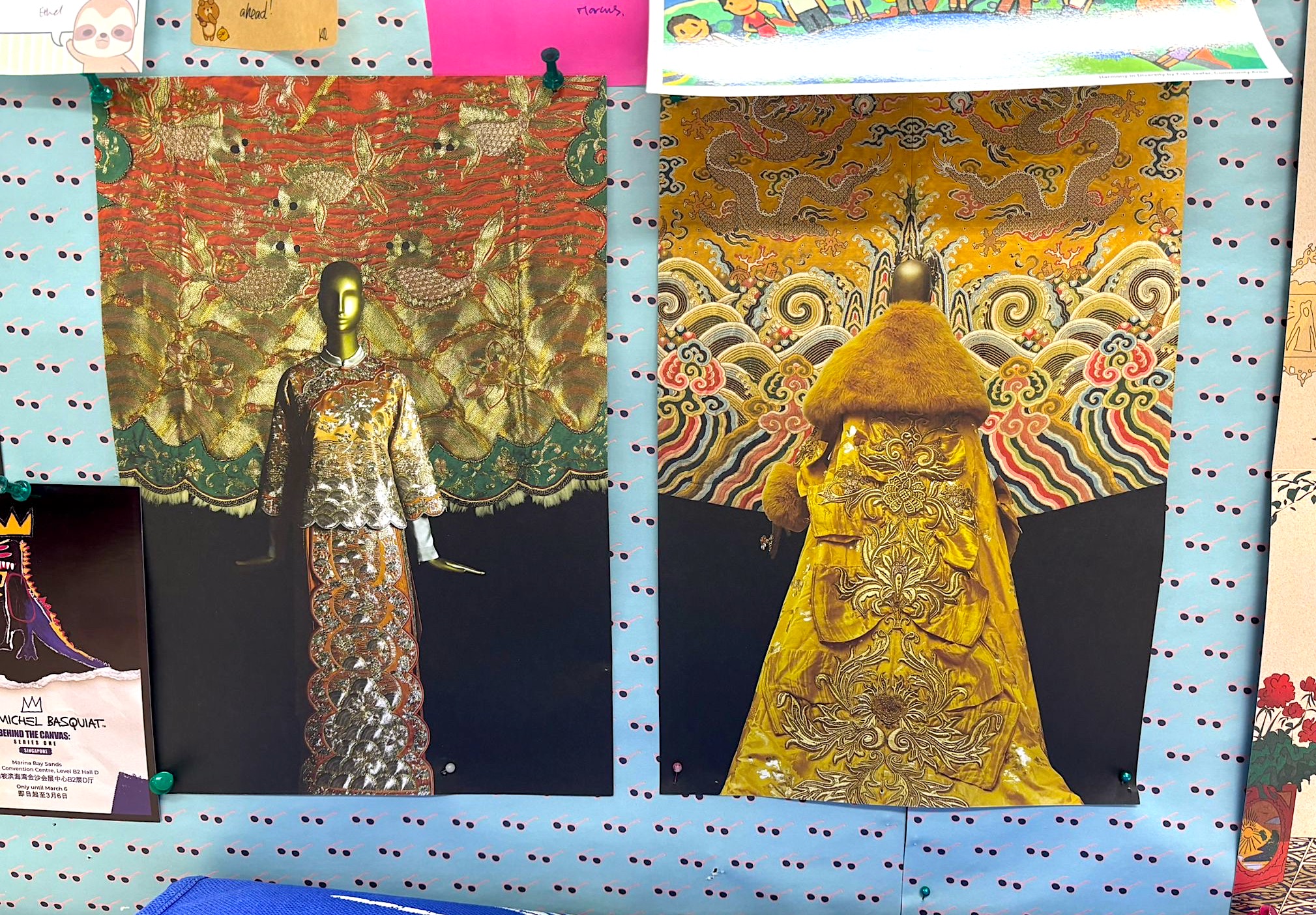[CAPTION: A friend of mine sent me this photo last month: a fellow teacher in the school she’d just started working in had these pinned up at her desk. It warmed my heart to see the impact the exhibition GUO PEI: CHINESE ART & COUTURE had, and still has today. ]