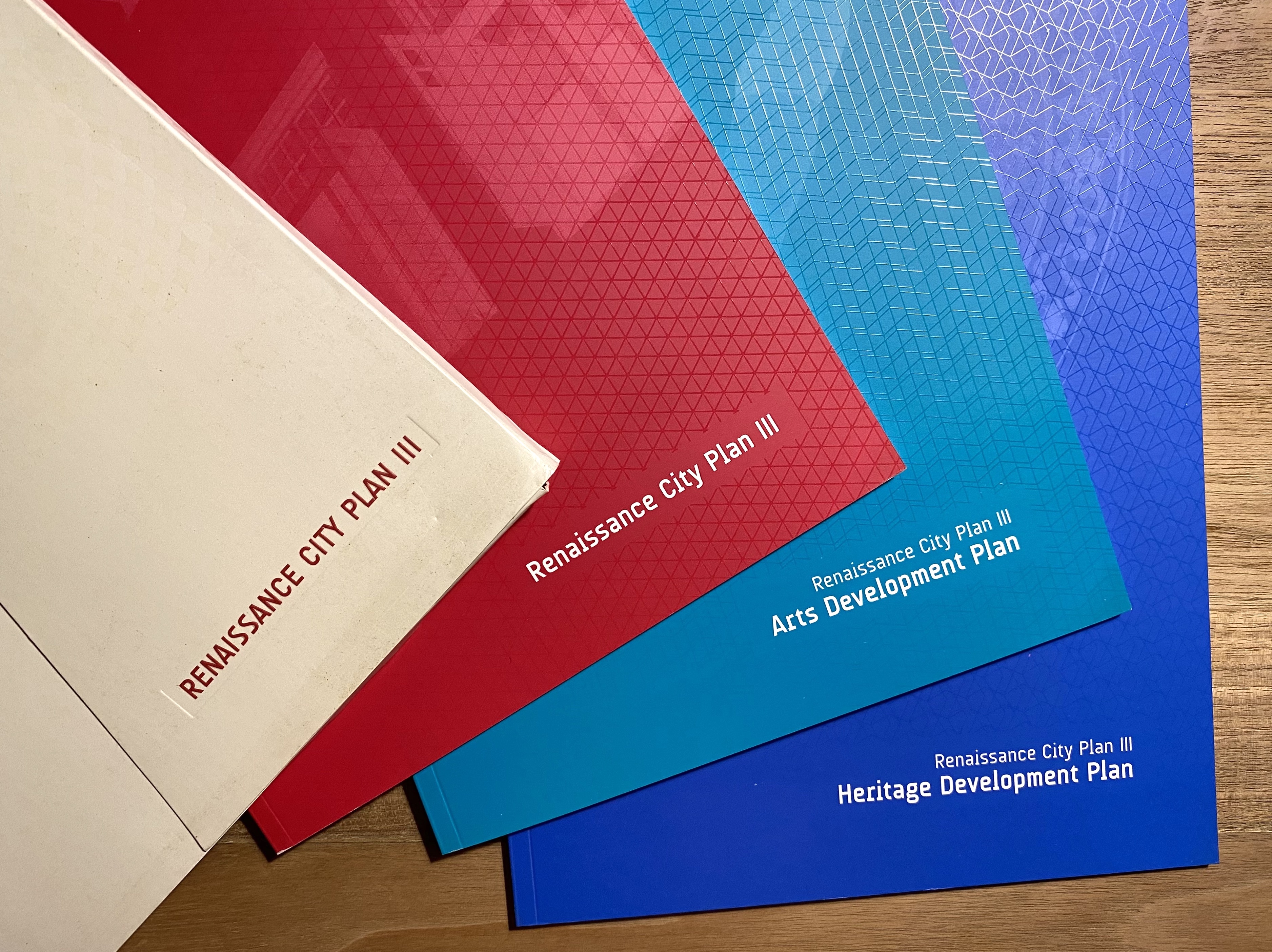 [CAPTION: Renaissance City Plan III – While at the former Ministry of Information, Communications and the Arts (MICA), I had the joy and privilege of working with a small group of like-minded arts administrators in articulating a major cultural masterplan for Singapore. I pretty much wrote the main plan (the book in red), which had three broad strategic outcomes: Distinctive Content, Dynamic Ecosystem, Engaged Community. Or in other words, we need to invest equally in good content, strong (arts) business and involved community in the arts and culture sector – if one part of this triumvirate is missing, we don’t have a thriving sector. ]